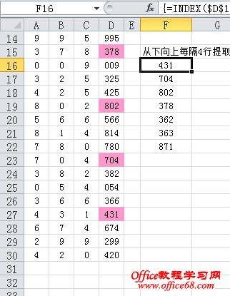 公式输入完毕,按Ctrl+Shift+Enter结束,然后拖动填充柄向下填充公式。同理,如果要每隔N行提取数据,则将上述公式中用红色标识的“4”表示改为相应的数值即可