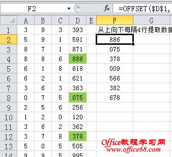 要在Excel工作表的某列中每隔N行提取数据,可以OFFSET或INDEX函数。假如数据在D1:D1000中,现在要每隔4行提取一个数据,即提取D列第4、8、12等行的数据,如图。