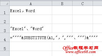 返回“郭靖、黄蓉”。那么要在公式的结果中返回英文双引号,该怎样写公式呢?实际上,公式中用双引号括起来的连续两个双引号即返回一个双引号,或四个双引号返回一个双引号。例如在A1单元格中包含字符串“Excel,Word”,要用公式将其中的逗号替换为顿号,同时给每个单词加上英文双引号,在A3单元格中输入下面的公式即可: