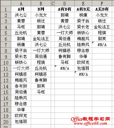有时在Excel中需要对两列进行比较,并提取两列中相同或不相同的数据,例如A列和B列分别包含一些人员名单,现在需要找出两列中都存在的姓名(A有B有)、A列中存在B列中不存在的姓名(A有B无)及A列中不存在B列中存在的姓名(A无B有),并分别放置到D、E、F列中。 假如两列名单分别在A2:A20和B2:B15区域中,用下面的两组数组公式即可获取相应的名单,每个公式输入完毕后,需按Ctrl+Shift+Enter结束。 1.获取A列和B列中相同的数据,在D2中输入数组公式: =INDEX($B$2:$B$15,MATCH(1,COUNTIF(D$1:D1,$B$2:$B$15)+IF(COUNTIF($A$2:$A$20,$B$2:$B$15),1,0),0)) 或: =INDEX(A:A,SMALL(IF(COUNTIF($B$2:$B$15,$A$2:$A$20),ROW($A$2:$A$20),4^8),ROW(A1)))&"" 2.获取A有B无的数据,在E2中输入数组公式: =INDEX($A$2:$A$20, MATCH(0, COUNTIF($B$2:$B$15, $A$2:$A$20)+COUNTIF(E$1:E1, $A$2:$A$20), 0)) 或: =INDEX(A:A,SMALL(IF(COUNTIF($B$2:$B$15,$A$2:$A$20),4^8,ROW($A$2:$A$20)),ROW(A1)))&"" 3.获取A无B有的数据,在F2中输入数组公式: =INDEX($B$2:$B$15, MATCH(0, COUNTIF($A$2:$A$20, $B$2:$B$15)+COUNTIF(F$1:F1, $B$2:$B$15), 0)) 或: =INDEX(B:B,SMALL(IF(COUNTIF($A$2:$A$20,$B$2:$B$15),4^8,ROW($B$2:$B$15)),ROW(A1)))&"" 上述公式输入完毕后,分别拖动填充柄向下填充,第一组公式直到出现“#N/A”为止,第二组公式直到出现空值为止 |