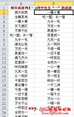 通常在Excel中要从一列中提取包含指定内容的数据,可以用自动筛选中的自定义筛选,并设置所包含的字符。如果要用公式来实现这种类似筛选的效果,可以在数组公式中用SEARCH函数来查找所包含的字符。假如在A2:A100区域中包含一些成语,要从中提取包含“一”字的成语。 在B2单元格中输入数组公式: =INDEX($A$2:$A$100,SMALL(IF(ISERROR(SEARCH("一",$A$2:$A$100)),"",ROW($1:$99)),ROW(A1)),1) 公式输入完毕按Ctrl+Shift+Enter结束,然后拖动填充柄向下填充,直到出现“#NUM!”为止,下同。 类似的,如果要从A列中提取开头为“一”字的成语,可用LEFT函数: =INDEX($A$2:$A$100,SMALL(IF(LEFT($A$2:$A$100,1)<>"一","",ROW($1:$99)),ROW(A1)),1) 提取A列中第二个字为“一”的成语,用MID函数: =INDEX($A$2:$A$100,SMALL(IF(MID($A$2:$A$100,2,1)<>"一","",ROW($1:$99)),ROW(A1)),1) 提取A列中最后一字为“一”的成语,用RIGHT函数: =INDEX($A$2:$A$100,SMALL(IF(RIGHT($A$2:$A$100,1)<>"一","",ROW($1:$99)),ROW(A1)),1) |