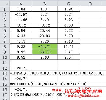 在Excel中要获取区域中绝对值最大的数,可以用下面的几个公式,假如数值所在的区域为A1:C10,如图。 在A12单元格中输入公式: =IF((MAX(A1:C10))>-MIN(A1:C10),MAX(A1:C10),MIN(A1:C10)) 绝对值最大的数为区域中的最大值或最小值,利用该特点,公式先比较区域中的最大值与最小值的相反数,如果前者大于后者就返回区域中的最大值,否则返回最小值。 或: =PERCENTILE(A1:C10,MAX(A1:C10)>-MIN(A1:C10)) PERCENTILE函数的语法: PERCENTILE(array,k) 返回数组或区域中数值的第k个百分点的值,k为0到1之间的百分点值,包含0和1。如果区域中的最大值大于最小值的相反数,则公式变为: =PERCENTILE(A1:C10,TRUE) 这里第二个参数TRUE等同于1,公式返回最大值,否则返回最小值。 或用下面的数组公式,公式输入完毕后按Ctrl+Shift+Enter结束: =MAX(IF(MAX(ABS(A1:C10))=ABS(A1:C10),A1:C10)) 当区域中最大值与最小值的绝对值相等时,该公式返回最大值。 同理,下面的数组公式获取区域中绝对值最小的数: =MAX(IF(MIN(ABS(A1:C10))=ABS(A1:C10),A1:C10)) |