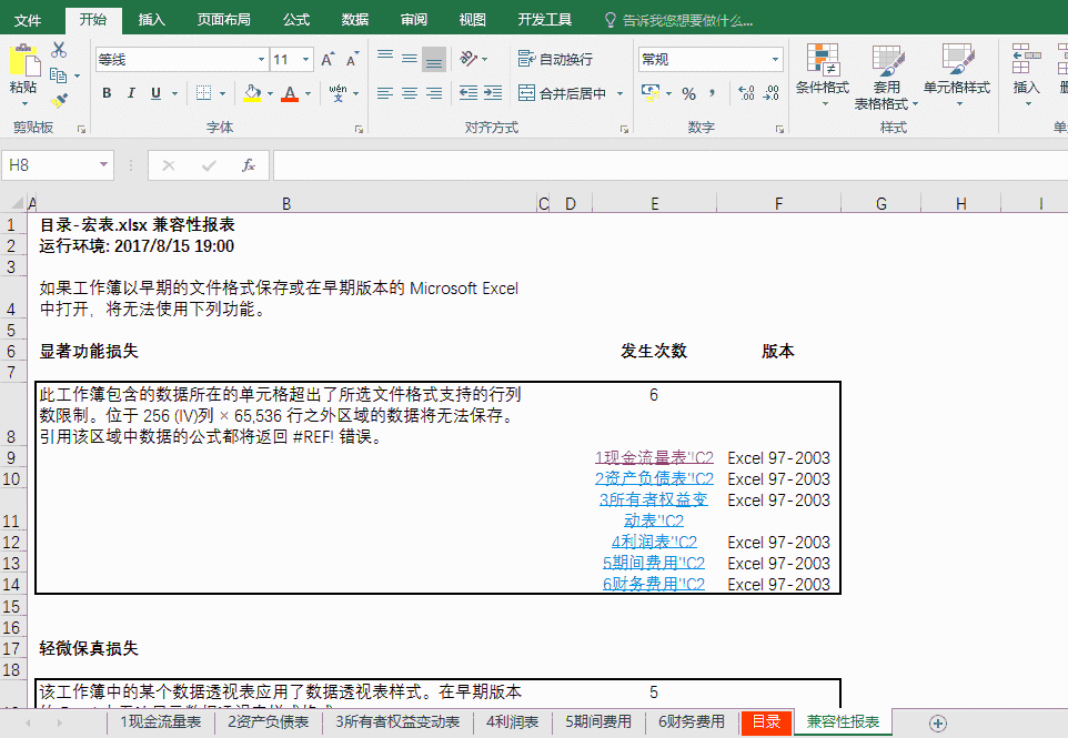 原理:利用Excel中自带的“检查功能”,将2003及以上版本(无XFD列)无法兼容的公式检索出来。