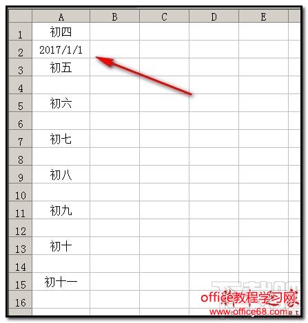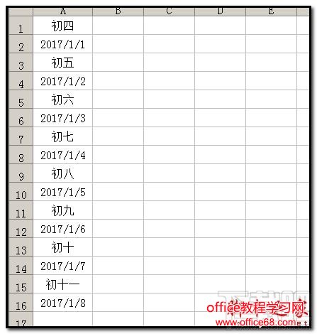 7、按键盘的CTRL+回车键后,A1到A16单元格中空白无数据的单元格即显示了从2017/1/1到2017/1/8连续的日期.