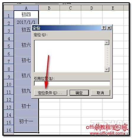 3、再选中A1到A16单元格;接着再按键盘的F5,弹出定位设置框;在框内点“定位条件”