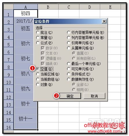 5、点确定后;A1到A16单元格中空白无数据的单元格即选中;