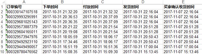Excel表格冻结首行操作,我们天天都在用。但是你是否真正明白“首行”的含义是什么?以及excel怎么冻结首行呢? 先来看有标题字段行(首行)的数据,截图如下。B、C、D、E列的时间分别是什么意思,一看就知道,对应的是:下单时间 、付款时间、发货时间、买家确认收货时间。