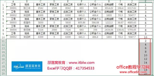 解释:我们需要隔两行插入一行,起始数字就是2,然后以2的倍数的数字下拉。如果是想实现每隔3行插入一行,就可以输入类似3、6、9、12这样的等差数列。