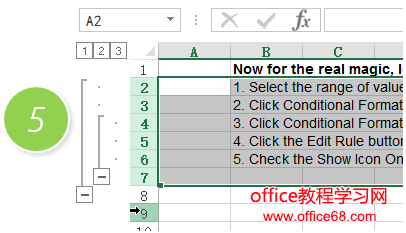 最后完成Excel工作表的层级大纲结构,点击图5处的数字1,2,3顺序打开层级显示或单击减号收拢层级显示。大家可以实际操练感受。