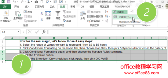 具体方法如下:打开工作簿后,根据层级大纲显示的前后关系(比如下图需要先显示1、2条步骤,再展开显示3、4、5步骤)。首先选中对应3、4、5步骤的行记录(下图1处),紧接着在“数据-创建组”按钮处创建大纲结构(下图2处)。