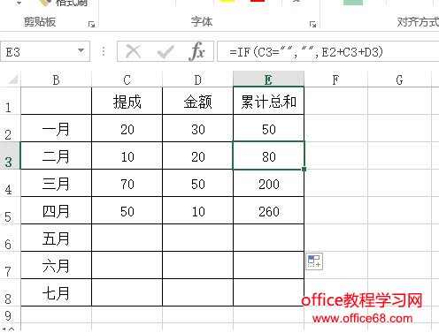 如果C3单元格为空,则E3单元格也为空,否则就是前面三个单元格的累加。是不是看上还蛮简单的。这样一个销售提成累计统计表就设计好了。
