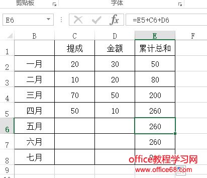 看上去没什么问题,但问题还是来了,能否五月数据不填写的时候,E6单元格不显示累加?本例的关键点在这里,怎么实现呢?