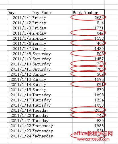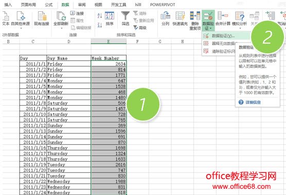 选中下表中Week Number的区域,单击“数据-数据验证”(2013以下版本叫数据有效性)。(下图2处)