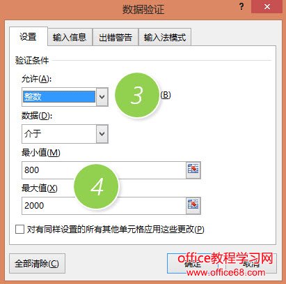 然后在新弹菜单中,允许选择“整数”,设置数据介于800到2000之间有效。(如下图3、4处)