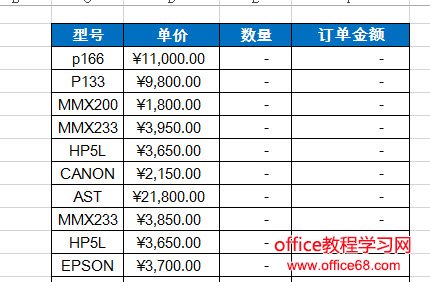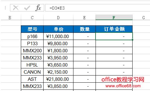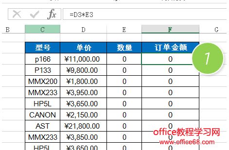 就是带公式的单元格,在没有统计前,显示为一个横杠的效果,显得非常的高大上。如何设置呢? 具体操作如下: 首先,将“数量”设置为“0”,然后在“订单金额”把计算公式设置好。(下图1处)