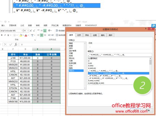 然后选中下图中所有的“0”单元格,然后按Ctrl+1打开单元格格式设置,在自定义处,选择下图中系统自带的格式类型。(下图2处)