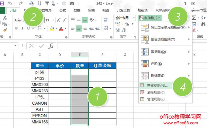 具体操作如下: 假设要对数量字段列设置该格式,可以选中区域,然后单击“开始-条件格式-新建规则”。(下图 4 处)