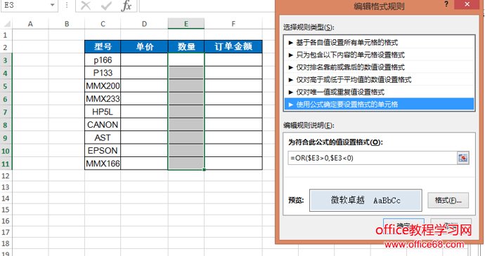 在新弹窗口中,选择利用公式创建条件格式,条件公式如下: =or($E3>0,$E3<0) 意思利用“或”函数满足单元格大于0或小于0,则单元格出现蓝色底纹。