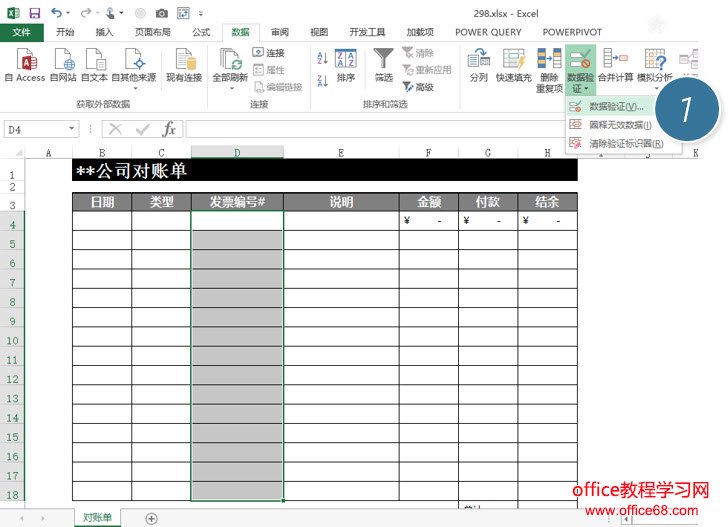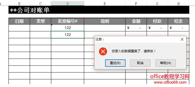 本例是防止公司对账单重复录入,需要都发票编号列设置数据有效性。