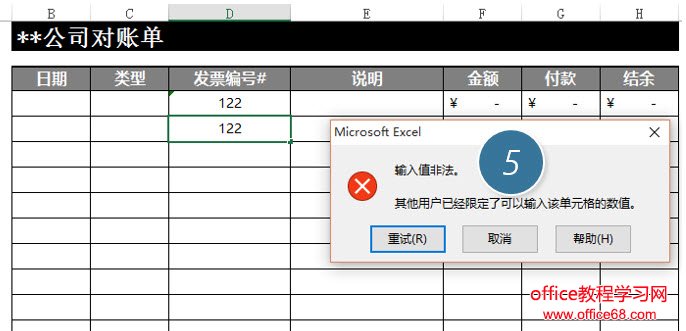 确定后,如果在“发票编号”列输入相同的内容,系统就会提第二个重复内容无法输入,就会出现下图的报错窗口。(下图4处)