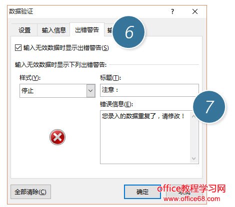 在“出错警告”中,将标题和错误信息处输入下图内容。(下图6处)