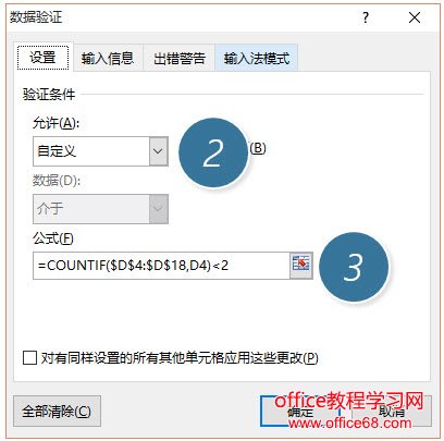在新弹窗口中,允许选择“自定义”(下图2处),在公式处输入=COUNTIF($D$4:$D$18,D4)<2 (下图3处)