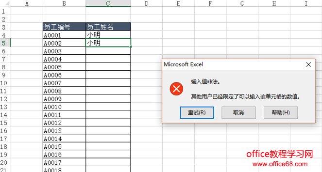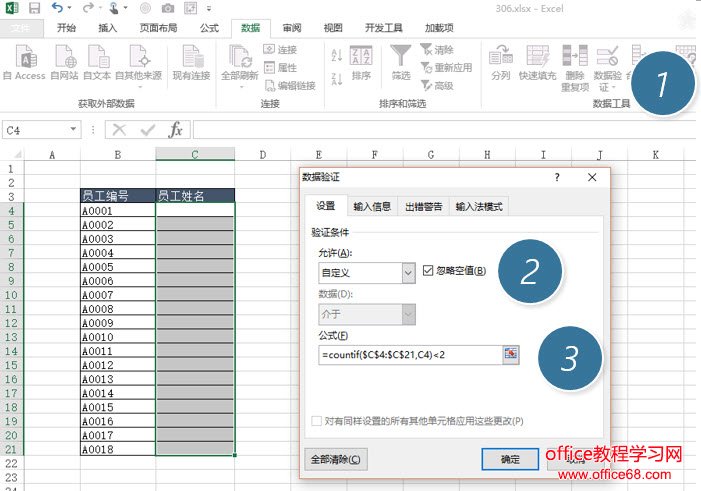 问题:如何保持排序的时候图片与单元格一起移动? 解答:如何限定单元格数据的重复录入又限定单元格内容的位数? 假设我们需要对C列的姓名进行限制,名字不能重复,名字不能超过四个字,那应该如何设置呢?如果你看看过《241技巧:如何防止单元格区域内重复录入数据?》(点击访问)这个技巧,应该会知道应该如何设置放置重复录入的设置。这里先回顾一下。 具体操作如下: 选中“C4:C21”在“数据-数据验证(数据有效性)”,选择自定义,并输入重复项判断公式:=COUNTIF($C$4:$C$21,C4)<2 相信大家对这个都比较理解。(下图 3 处)
