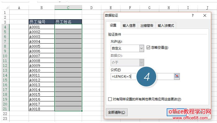 但这里有个问题,只能进行“单条件”的设置?如何设置限制单元格的输入位数呢? 如果在自定义中输入公式 =len(C4)<5 注意C4 是工姓名的起始位置。Len函数是返回C4单元格的内容长度。如果小于5,才允许写入该单元格。(下图 4 处)