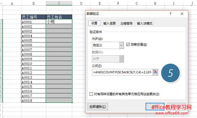 接下来重点来了,数据有效性不能像条件格式那样叠加上去,也就是说不能对一个单元格同时设置两个数据有效性,这可如何是好呢?而且工作中确实存在多条件的数据有效性的情况。这个是时候就需要另外一个函数来帮忙,那就是and() 函数。利用and() 把多个条件“联系”起来。 具体操作如下: 在自定义的公式中输入 :=AND(COUNTIF($C$4:$C$21,C4)<2,LEN(C4)<5)=TRUE 当AND中的两个条件都满足,就是=TRUE的时候,才允许单元格填写内容。(如下图 5 处)