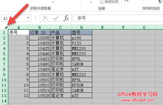 选中下图的全选Excel表格按钮,(或是选中空白单元格,按Ctrl+A)都是全选所有表格区域。