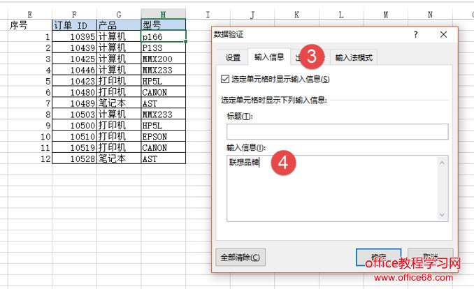点击“数据验证—输入信息”,在输入信息中“联想品牌”。(下图4处)