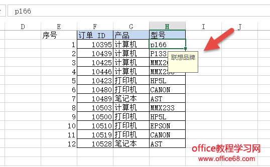 单击确定后,点击P166单元格就会出现“联想品牌”的提示。
