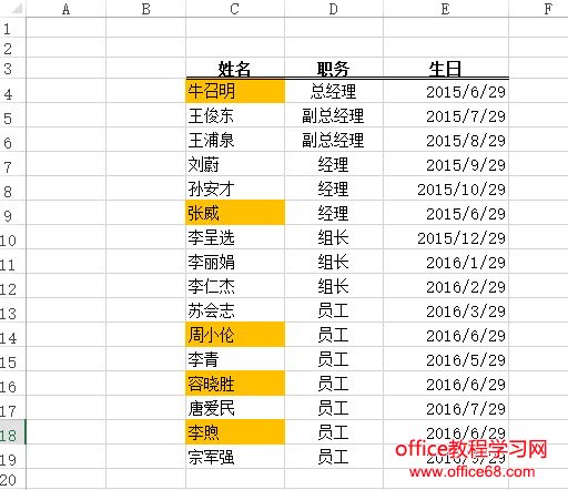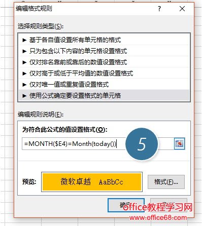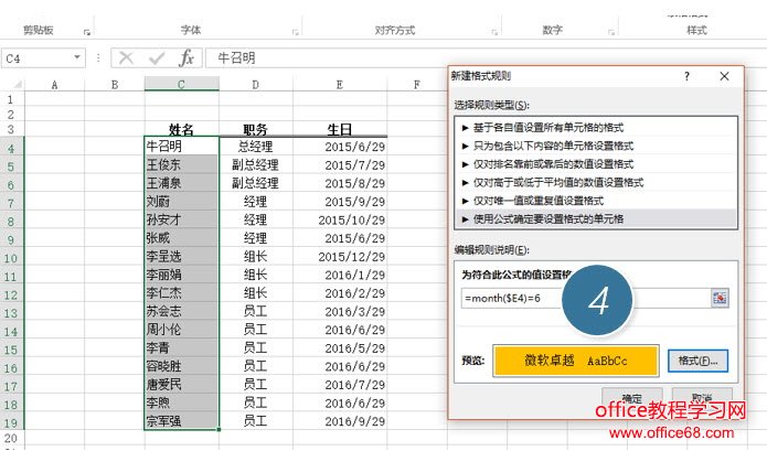如果月份6等于6,则姓名对应的单元为橙色显示。注意公式中E4中的4前面的美元符号去掉,保证条件可以逐行判断其他人的生日月份。