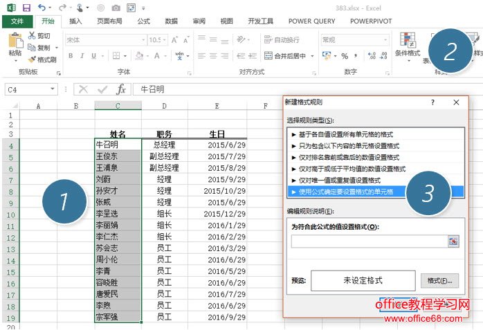选中需要设置颜色的姓名区域(下图1处),点击“开始—条件格式---新建格式---使用公式确定设置格式的单元格”