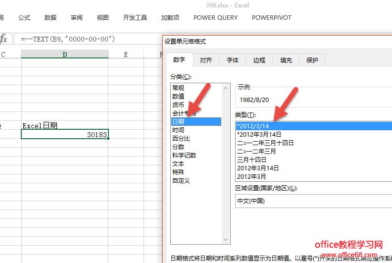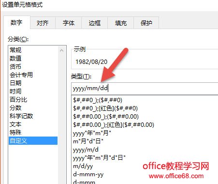 最后补充一下,如何改为1982/08/20格式?只需要在单元格自定义格式里面设置一下即可。将类型改为yyyy/mm/dd格式即可。(下图箭头处)