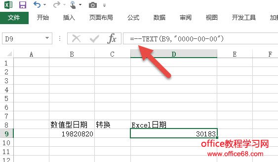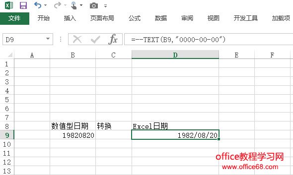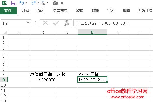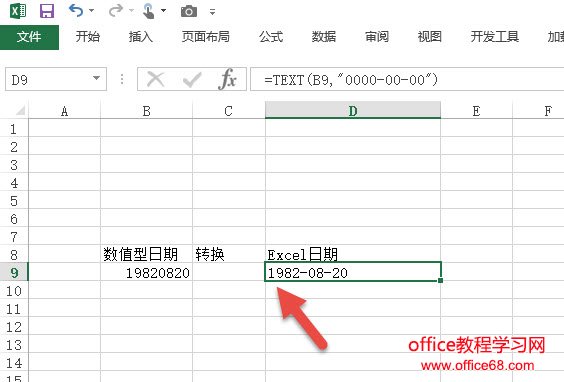 Text是强大的单元格包装函数,本例是将B9单元格的数值转换成0000-00-00的结构,需要注意的是任何函数参数超过两个字符,需要用引号引起来。