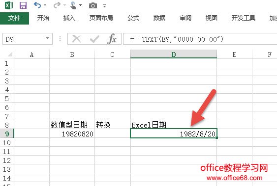 例如将B9单元格中的19820820转换成日期格式。只需要在D9单元格输入如下个函数: