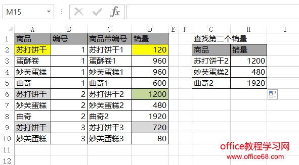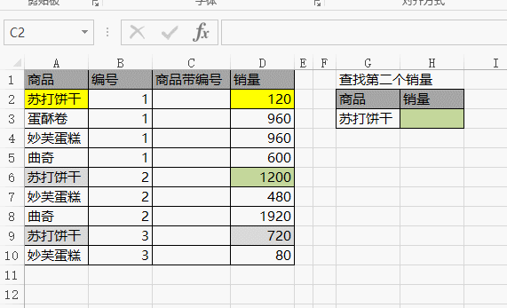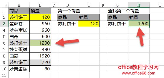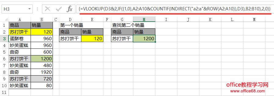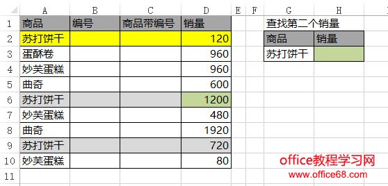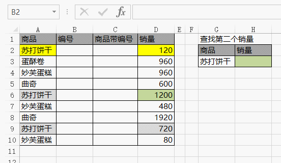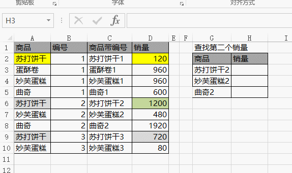 问题:如何用Vlookup匹配第二销售量的数据? 解答:利用Vlookup函数与countif函数组合搞定。 具体操作如下: 本案例题目很容易看懂,希望能在H3单元格自动匹配“苏打饼干”是第二销量的数值,正好对应下图的红色箭头的1200。