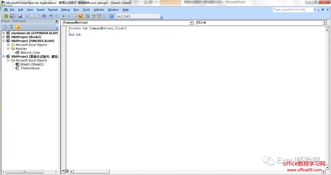 三、输入代码 1、双击可编辑状态的“命令按钮”,便进入VBA代码编辑器。