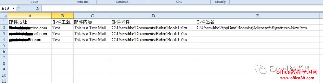 在日常工作中,经常会遇到需要群发邮件的情况,正常情况下只有一个个手工写邮件,然后发送。这样的工作效率可想而知。下面就介绍一个通过群发邮件的VBA程序。 一、数据准备 准备如下图的数据表,包括以下内容: 1) 第一列为“邮件地址”,必须是完整的带后缀的邮件地址。 2) 第二列为“邮件主题”,不同的收件人可以根据需要写不同的主题。 3) 第三列为“邮件内容”,不同的收件人可以根据需要写不同的内容。这里的内容在发送时是以纯文本格式发送的,在单元格里设置的格式均无效。 4) 第四列为“邮件附件”,附件必须带有完整的路径,且必须包括文件扩展名。 5) 第五列为“邮件签名”,签名必须带有完整的路径,且必须包括文件扩展名。这里的邮件签名是自动提取使用者邮箱里设置的签名,如果没有设置签名,那么将为空。