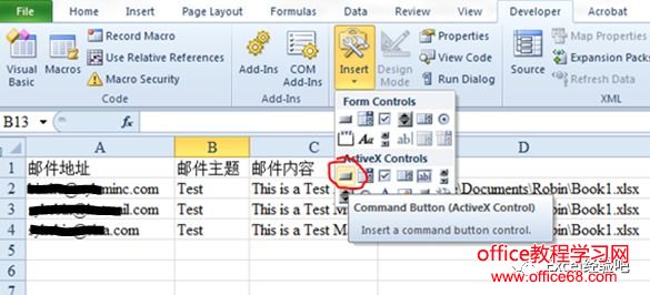 二、插入按钮 1、点击“开发者工具”页面,选择“插入”中的“控件工具”。然后选择“命令按钮”,如下图所示: