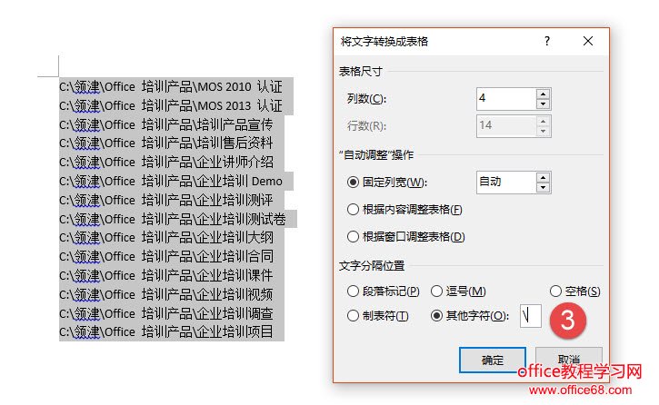 接下来就好办了。利用“插入-表格-文字转换为表格”功能,将路径转换成表格。(下图2处)