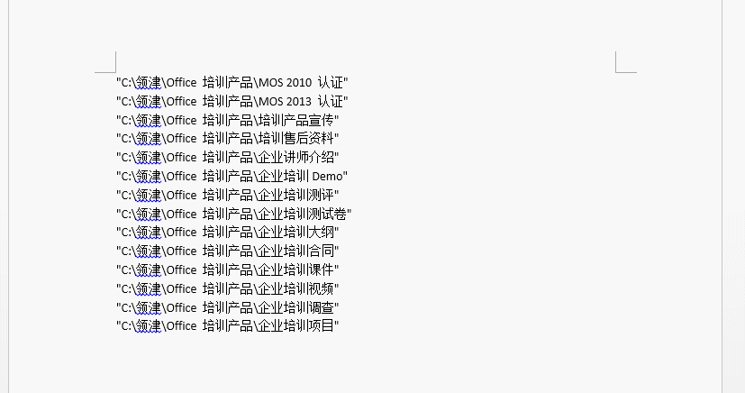 例如需要将“Office培训产品”下的所有文件夹名,批量复制到Excel中,奇怪这居然是个Word技巧。