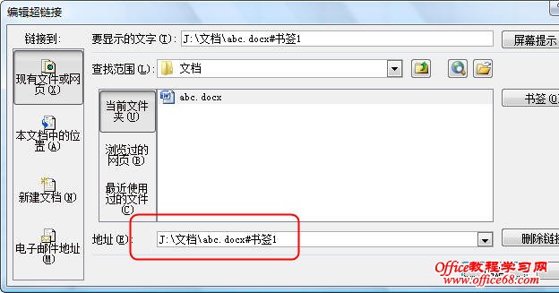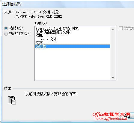 在Excel中可以利用超链接来打开某个Word文档,但如果要让超链接直接定位到Word文档内的某个指定位置,该怎样操作呢? 方法一:超链接到Word内的书签 1.在Word文档内插入书签。在Word 2010中,将光标定位到需要跳转的位置,在“插入”选项卡的“链接”组中单击“书签”,输入一个书签名称,单击“添加”。如下图在某个Word文档中添加了一个名称为“书签1”的书签。 2.在Excel 2010中右击需要设置超链接的单元格,选择“超链接”,弹出“插入超链接”对话框。找到并选择上述Word文档,这时在对话框下方的“地址”栏中即可看到文档的路径,如本例为“J:\文档\abc.docx”。这时不能通过单击“书签”按钮的方法添加书签,因为单击“书签”按钮Excel会弹出一个“Microsoft Excel 既不能打开传文件,也不能解析此类文件”的对话框,如图。 正确的方法是直接在路径后方添加“#书签1”,这时地址变成: J:\文档\abc.docx#书签1 单击“确定”关闭对话框完成超链接设置。 另外,还可使用HYPERLINK函数添加超链接,如在单元格中输入公式: =HYPERLINK("J:\文档\abc.docx#书签1","书签1") 或: =HYPERLINK("[J:\文档\abc.docx]书签1","书签1") 方法二:利用选择性粘贴 复制Word文档中指定位置附近的某些内容,然后在Excel中右击某个单元格进行选择性粘贴,这时会弹出“选择性粘贴”对话框,可以看到这个对话框与在Excel中复制后再进行选择性粘贴时的对话框不同,如下图。 选择“超链接”后确定,这样,单击该单元格即可跳转到Word文档中的指定位置 |