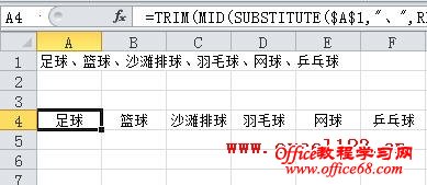 例如A1单元格中包含用顿号分割的文本“足球、篮球、沙滩排球、羽毛球、网球、乒乓球”,用下面的公式将顿号分隔的数据分列到一行中: