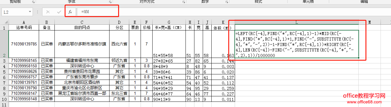 上图是某员工通过函数公式计算包裹体积。现在需要将K列的公式提取出来并以文本形式显示。 第一步:选中K列数据区域,打开【名称管理器】,新建一个MM的名称记录,引用位置为: =GET.FORMULA(GET.FORMULA!$K$2:$K$10)