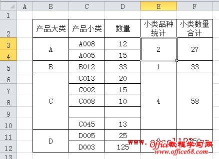 然后按Ctrl+Enter即可将公式输入到E列各合并单元格,该公式返回合并单元格对应C列的小类产品品种统计。用同样的方法将下面的公式输入到F列,在各合并单元格中即可得到小类产品的数量合计:
