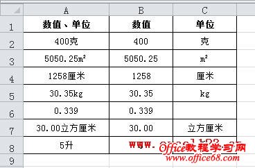 通常在设计Excel表格时会将数值及其单位放在不同的单元格内,以便数值参与运算。但有时一些用户会将单位的数值放在同一单元格内,如输入为“30克”、“200.25平方厘米”等,这就无法对其进行计算了。要分离这样的数值和单位,将其放到不同的单元格中,可以用下面的公式,假如上述形式的数值在A列,如图: