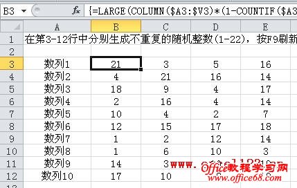 要在Excel中生成不重复的随机整数列,例如将1-22这22个数进行随机排列,通常用在辅助列中输入RAND函数并排序的方法来实现。如果不用辅助列和VBA,用数组公式也可以实现。在A2单元格中输入数组公式: =LARGE(ROW($1:$22)*(1-COUNTIF($A$1:A1,ROW($1:$22))),INT(RAND()*(23-ROW(A1))+1)) 公式输入完毕按Ctrl+Shift+Enter结束,然后拖到填充柄填充公式到A23,即可在A2:A23中生成1-22这22个数,并随机排序。 说明: 1. “ROW($1:$22)”产生一列包含1-22的垂直数组,如果需要更多的数值,将“22”改为所需数值即可。 “1-COUNTIF($A$1:A1,ROW($1:$22))”用COUNTIF函数判断已产生的数值,如果某个数字已在A列出现,则其对应位置为0,否则为1。 上述两项相乘后得到一个包含“0”和未出现数字的数组,并作为LARGE函数的第一个参数。例如在A9单元格中两项相乘的结果为数组: {0;0;3;4;0;6;0;8;9;10;11;0;0;14;15;16;17;18;19;20;0;22} 其中“13、7、5、1、12、2、21”这7个数已在A列中出现,其对应位置为“0”。 2.“INT(RAND()*(23-ROW(A1))+1)”为LARGE函数的第二个参数,其作用是产生一个随机整数,以A9单元格为例,由于已出现7个数字,还有15个数字未出现,故随机数的最大值为15,该项产生一个1-15之间的随机整数。 如果要在行中生成随机整数列,可用下面的数组公式,以B3单元格为例: =LARGE(COLUMN($A3:$V3)*(1-COUNTIF($A3:A3,COLUMN($A3:$V3))),INT(RAND()*(23-COLUMN(A3))+1)) 然后向右拖到公式到W3即可。也可选择B3:W3继续向下填充公式在多行中产生随机整数列,如图。 |