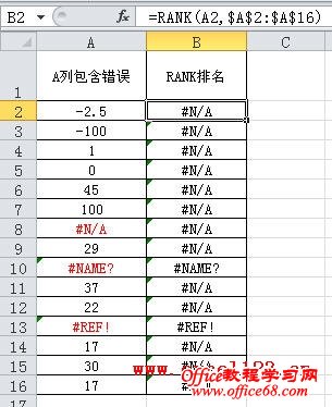 大家知道,Excel中的RANK函数可以获取某个数值在其所在区域中的排名,但有时区域中可能包含错误,这时RANK函数会返回错误而无法得到正确的结果。例如下图中在B列获取A列各个数值的排名,如果直接用RANK函数:=RANK(A2,$A$2:$A$16),B2单元格会返回“#N/A”错误。 当区域中包含错误值时,通常应先检查并修改错误,然后再用RANK函数排名。如果在某种情况下,需要在包含错误的区域中获取各数值的排名,可用下面的公式,以上图为例对A列按降序排名,在B2单元格中输入公式: =IF(ISERROR(A2),"",COUNTIF($A$2:$A$16,">"&A2)+1) 然后填充公式至B16单元格,如图。 按升序排名时,将“>”号改为“<”即可,如C2单元格中的公式: =IF(ISERROR(A2),"",COUNTIF($A$2:$A$16,"<"&A2)+1) |